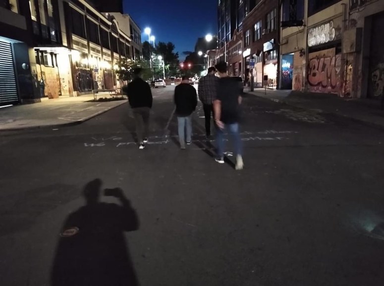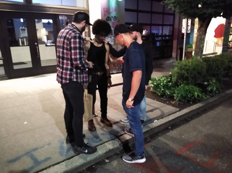 Heavy graffiti and boarded up storefronts surrounded us as we strolled past the barriers into the very middle of the occupied area around 10 pm. As David showed us around, a young female, with a backpack on, came running up saying, “Hey! Are you guys cops?” After denying this, she began telling us that if we were there to help to be watching out. Several women had gone missing at night or been assaulted. She said that if we see anything to report it to a vague someone. Charlie and some of the team started engaging with a young man sitting there who had dreads. Darren gave Rio a prophetic word and we were able to pray for him. We found out later, he was a head security leader and spokesman for the group.