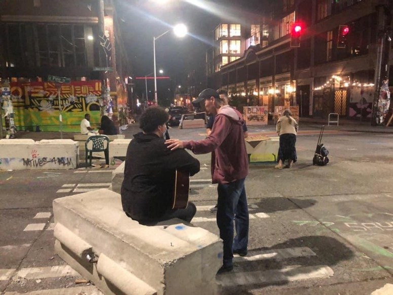 I teamed up with David beginning a conversation with a young man named Jeff. We sat on a random couch in the middle of the street next to a dozen or more tents set up in front of the boarded up precinct. Huge concrete barriers ran the length of the streets in the middle and formed barricades that blocked the roads coming in. As we talked with Jeff, David gave him a word that allowed us to talk more about why we were there. He welcomed us as long as we were not going to be yelling that all the people would be going to hell. There had been several people who came through earlier that had been beaten up and/or thrown out of The CHOP for doing that. He made sure to tell us it was very safe here and there were no problems as Rio had informed us.