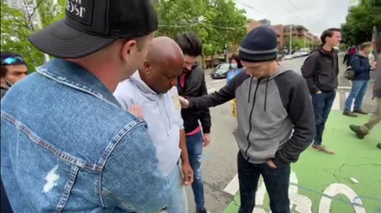 We headed down to see what was left without any plans to be able to do ministry there. We intended on taking a few before and after photos and seeing if any of the CHOP-pers were there. Along the way, we found many on the streets who had been a part of this community. As we walked the perimeter, we found a group of protesters opposite the police at the top of the road that used to lead to CHOP. They were swearing, jeering, and spitting at the police from one side of the police tape.